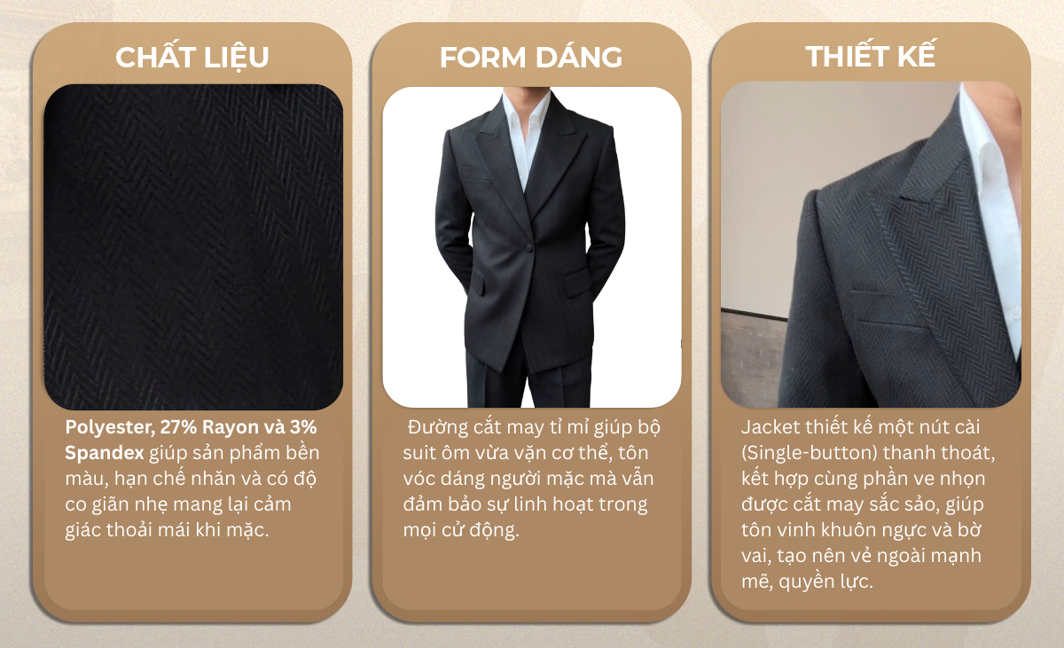 Kiểu dáng hiện đại: Jacket thiết kế một nút cài (Single-button) thanh thoát, kết hợp cùng quần âu đồng bộ tạo nên tổng thể chỉn chu, chuyên nghiệp.