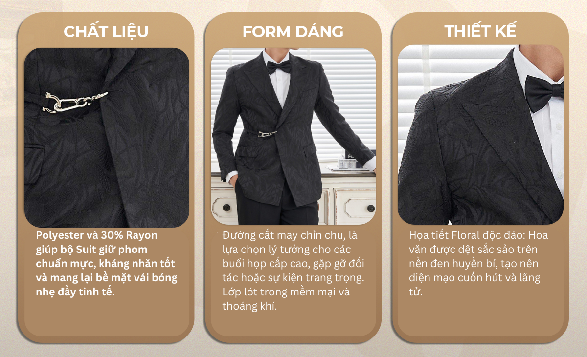 Họa tiết Jacquard: Hoa văn hoa chìm tinh tế trên nền vải đen tạo chiều sâu đầy cuốn hút.