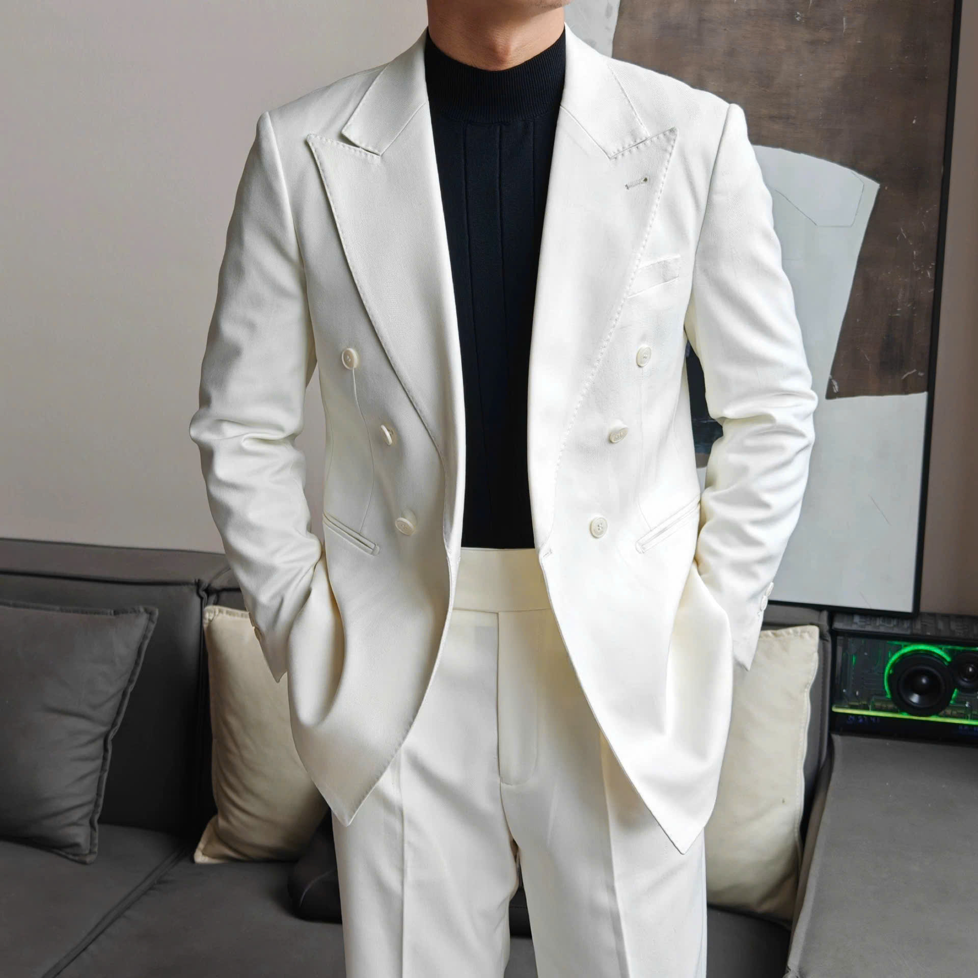 Thiết kế Double-Breasted: Kiểu áo hai hàng khuy phối ve nhọn bản lớn đầy quyền lực.