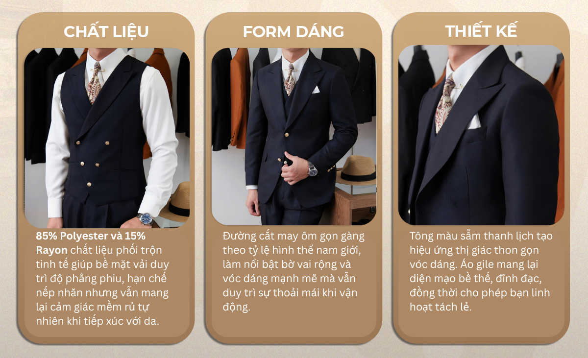 Bộ phối 3 mảnh (3-Piece): Bao gồm áo Jacket, Gilet (Waistcoat) và quần tây, mang lại sự linh hoạt tối đa cho các dịp trang trọng.
