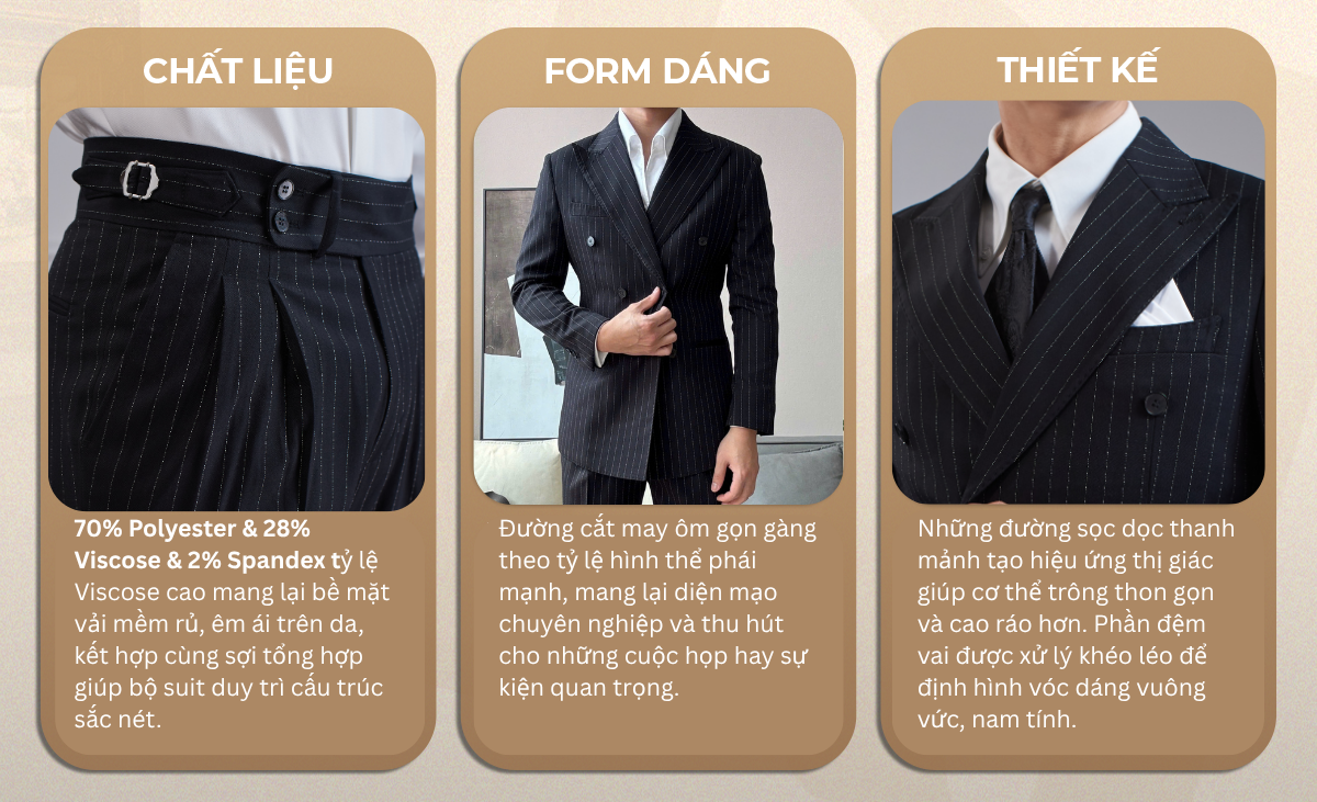 Thiết kế Double-Breasted: Kiểu áo hai hàng khuy cổ điển giúp tôn vinh phong thái đĩnh đạc.