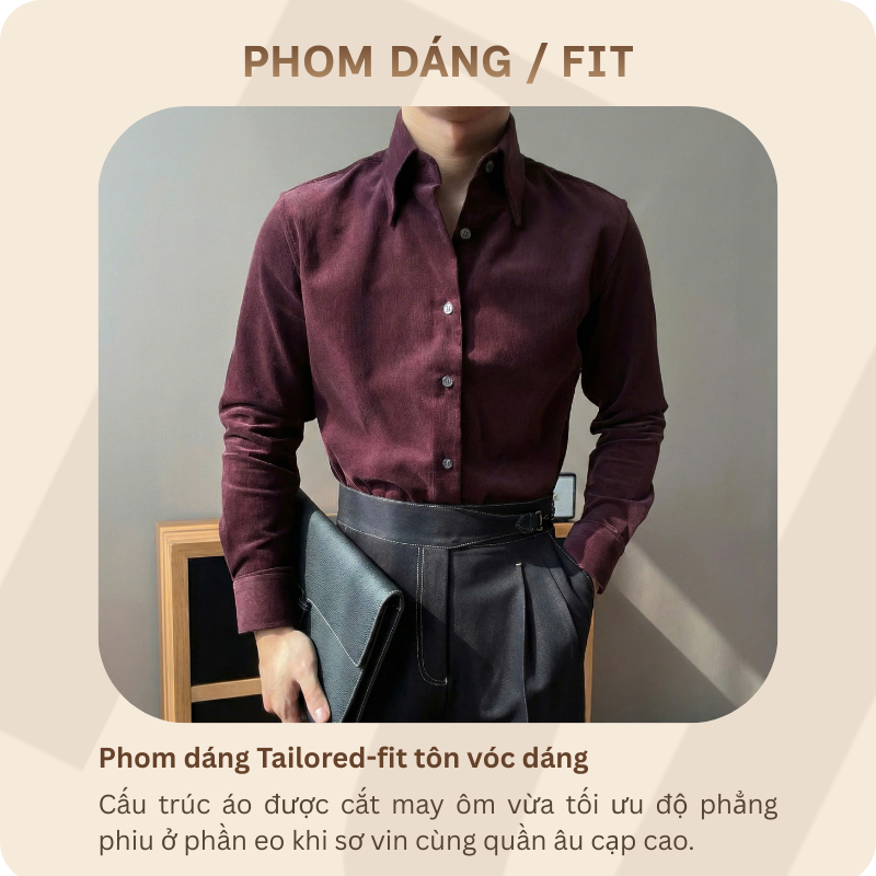 Phom dáng chỉn chu: Đường cắt may ôm nhẹ giúp tôn vóc dáng gọn gàng và lịch sự cho quý ông.