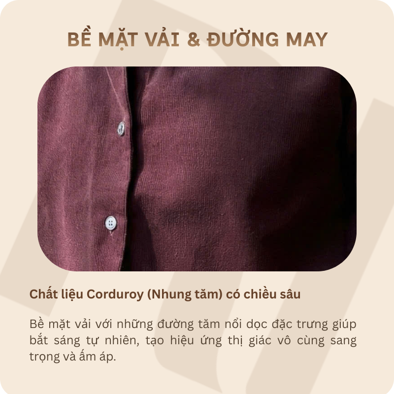 Bề mặt nhung tăm: Hiệu ứng gân nổi mịn màng tạo chiều sâu và nét sang trọng cho trang phục.