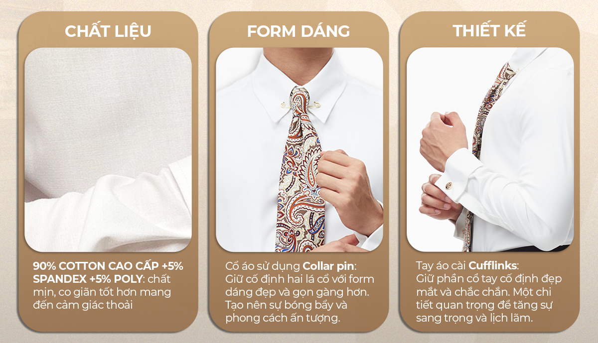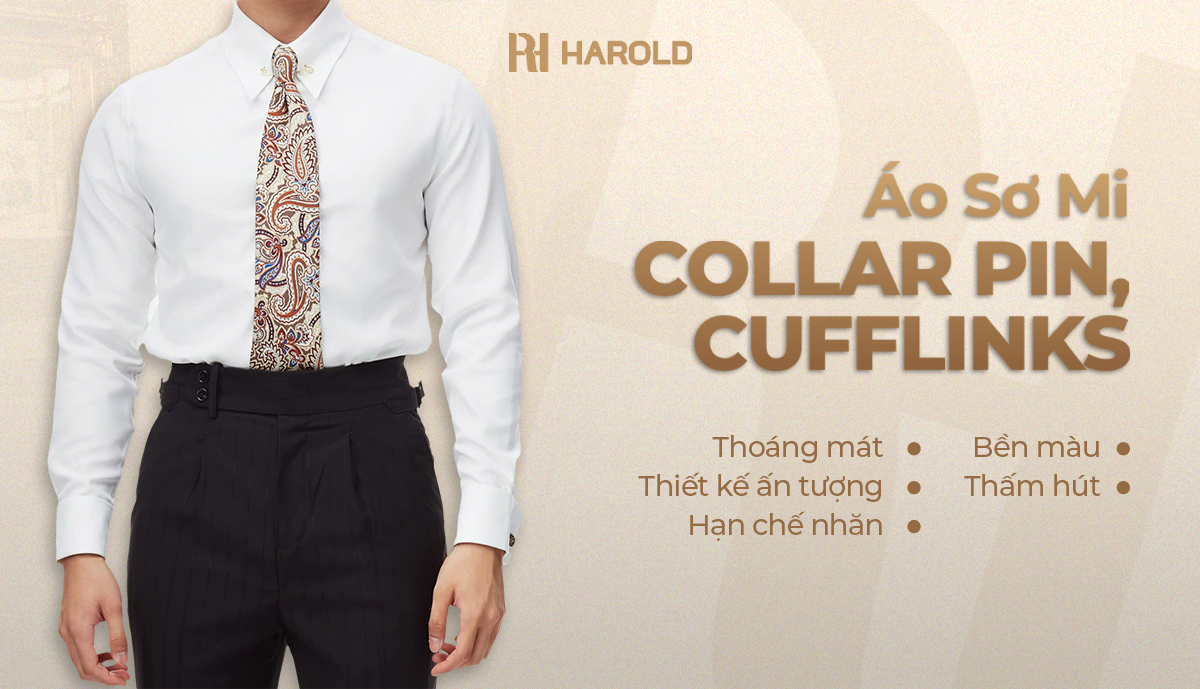• Thiết kế cổ ghim (collar pin) giúp cố định cổ áo luôn gọn gàng, đúng phom