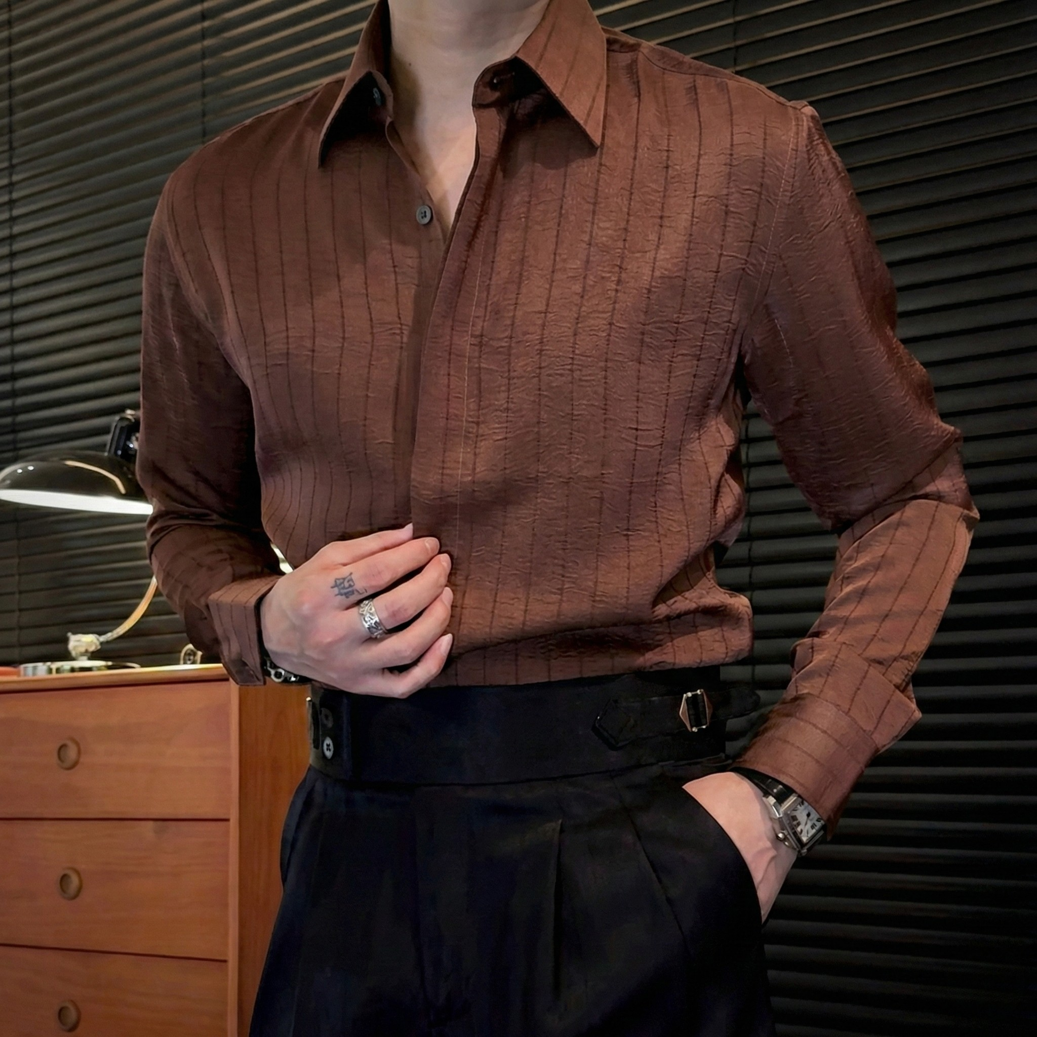 Sơ Mi Sọc Lụa Chìm Cổ Dấu Khuy