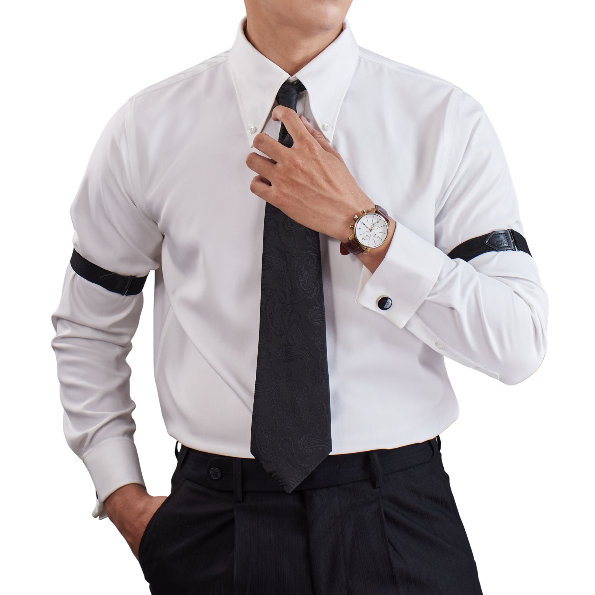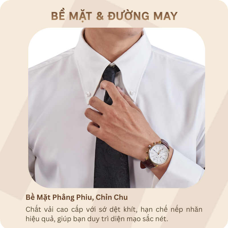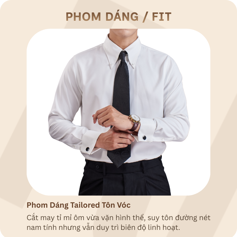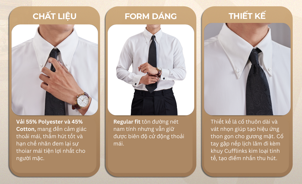 Tay áo măng sét (Cufflinks): Thiết kế tay dài chỉn chu, cho phép sử dụng khuy măng sét để tăng thêm phần tinh tế và đẳng cấp.