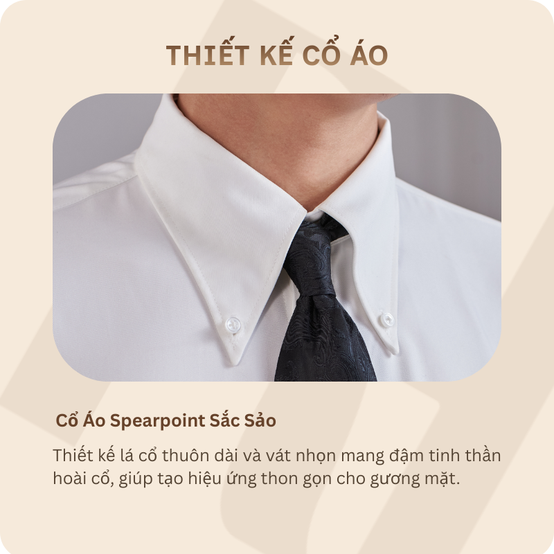 Cổ áo Spearpoint đặc trưng: Thiết kế cổ nhọn dài sắc sảo mang lại vẻ ngoài cổ điển, thanh lịch và đặc biệt phù hợp khi thắt cà vạt.